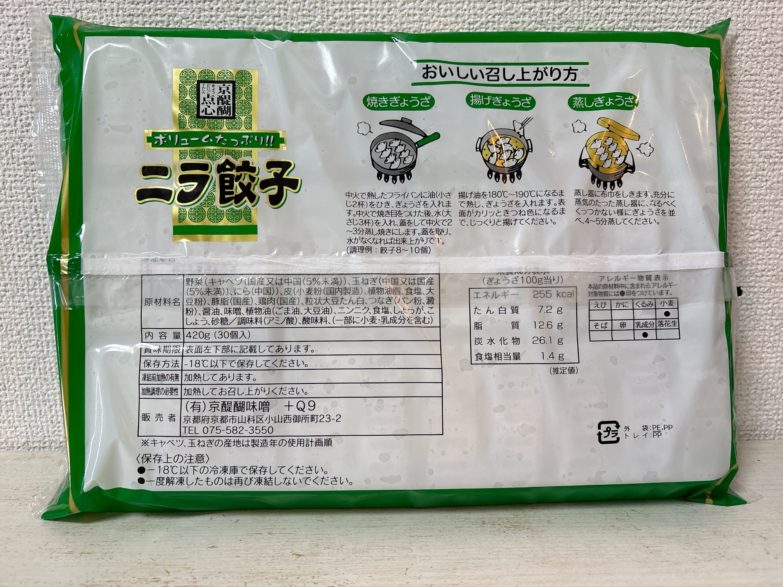 | 原材料 | 野菜(キャベ大(国産又は中国(5%未満))、玉ねぎ(中国又は国産(5%未満))、にら(中国))、皮(小麦粉(国内製造)、植物油脂、食塩、大豆粉)、豚脂(国産)、鶏肉(国産)、粒状大豆たん白、つなぎ(パン粉、澱粉)、醤油、味階、植物油(ごま油、大豆油)、ニンニク、食塩、しょうが、こしょう、砂糖/調味料(アミ/酸)、酸味料、(一部に小麦·乳成分を含む) |