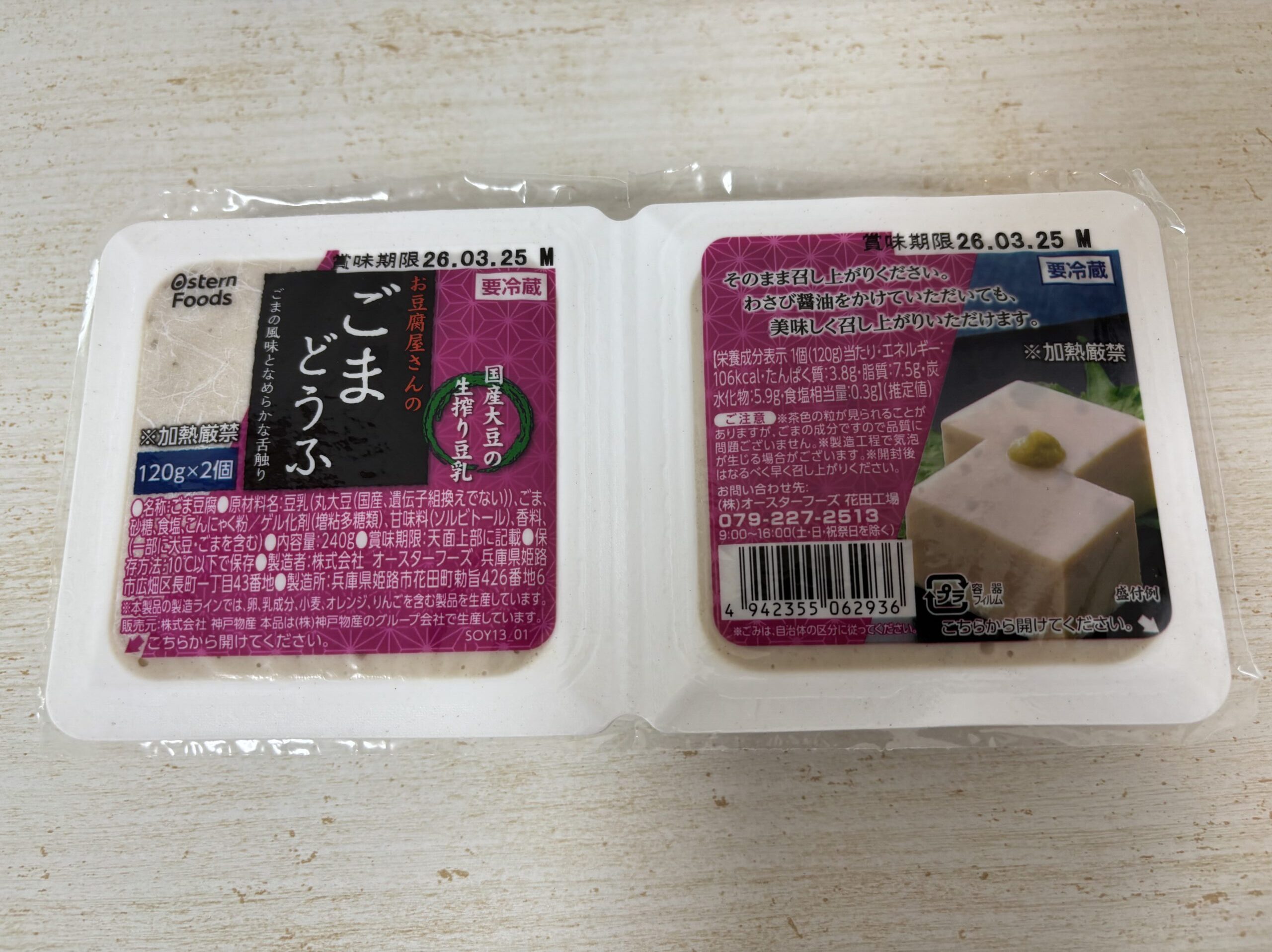 | 原材料 | 豆乳(丸大豆(国産、遺伝子組み換えでない))ごま、砂糖、食塩、こんにゃく粉/ゲル化剤(増粘多糖類)、甘味料(ソルビトール)、香料、(一部に大豆、ごまを含む) |