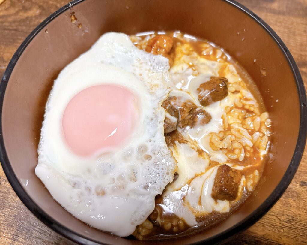 目玉焼きとチーズをトッピングして実食していきます。