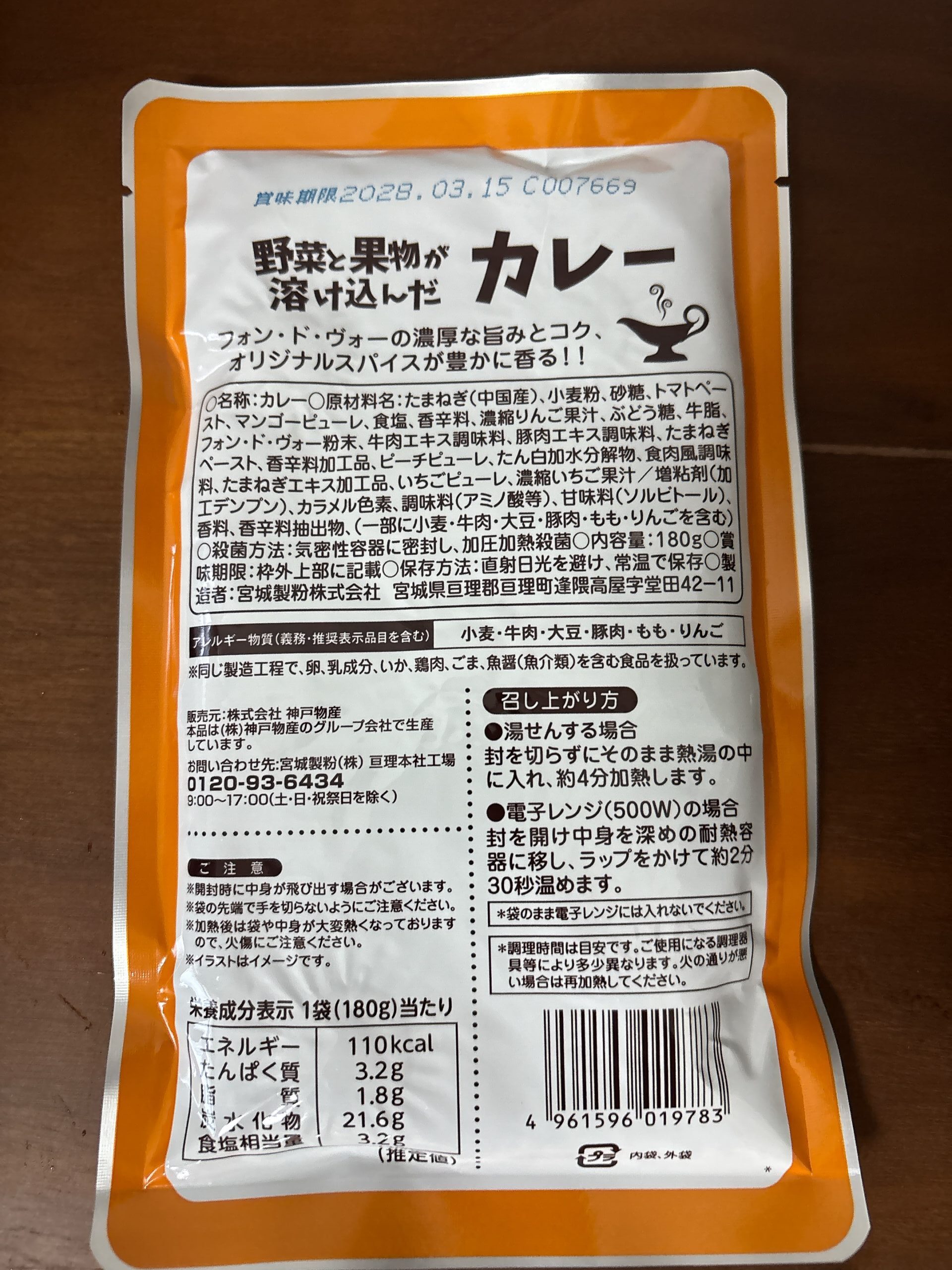 | 原材料 | たまねぎ(中国産)、小麦粉、砂糖、トマトぺースト、マンゴービューレ、食塩、香辛料、濃縮りんご果汁、ぶどう糖、牛脂、フォン·ド·ヴォー粉末、牛肉エキス調味料、豚肉エキス調味料、たまねぎぺースト、香辛料加工品,ビーチビューレ、たん白加水分解物、食肉風調味料、たまねぎエキス加工品、いちごピューレ、濃縮いちご果汁/増粘剤(加エデンプン)、カラメル色素、調味料(アミノ酸等)、甘味料(ソルビトール)、香料、香辛料抽出物、(一部に小麦·牛肉·大豆·豚肉·もも·りんごを含む) |