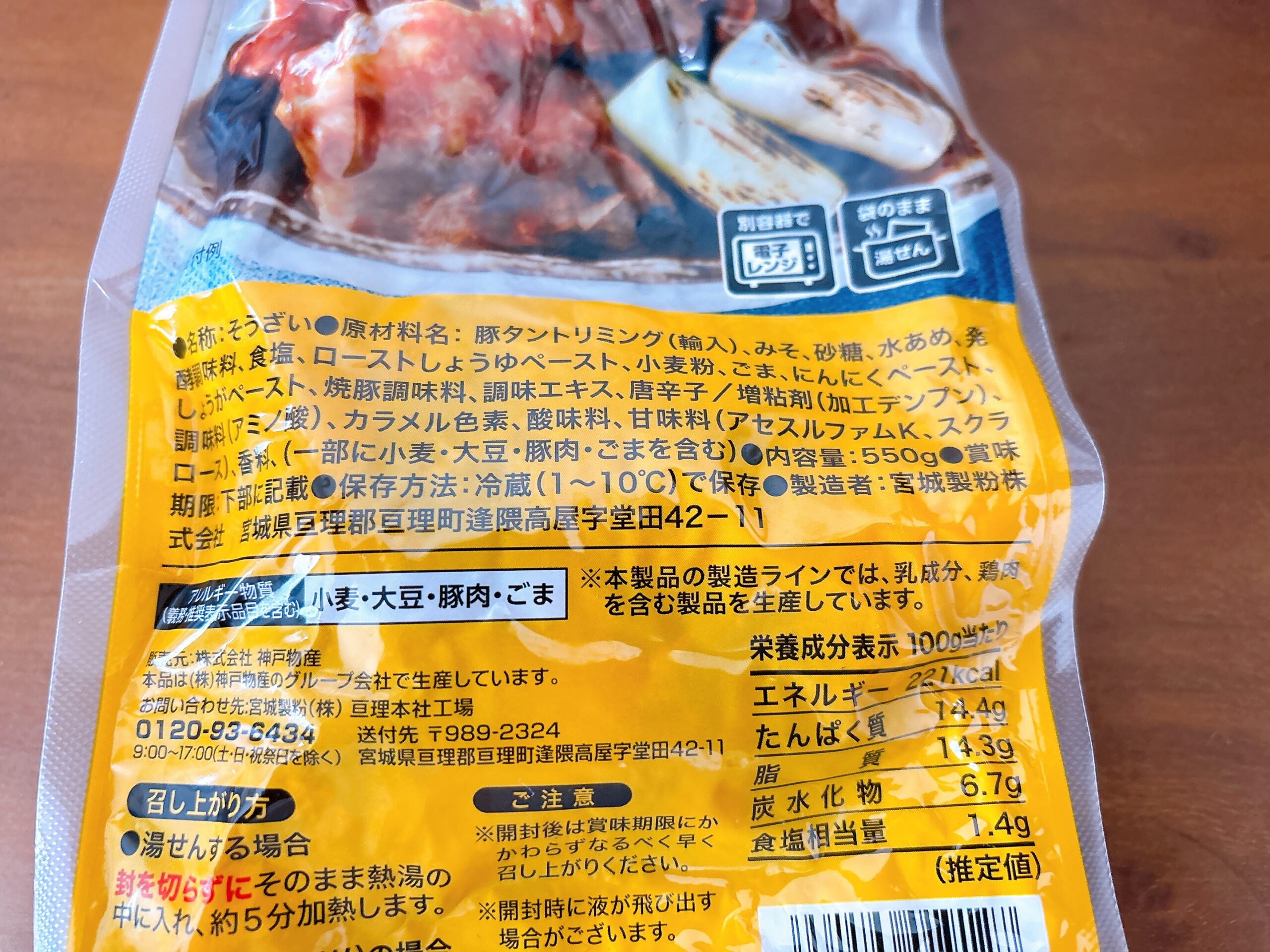 | 栄養成分表示(1袋当たり) | エネルギー:221kcal たんぱく質:14.4g 脂質:14.3g 炭水化物:6.7g 食塩相当量:1.4g (推定値) |